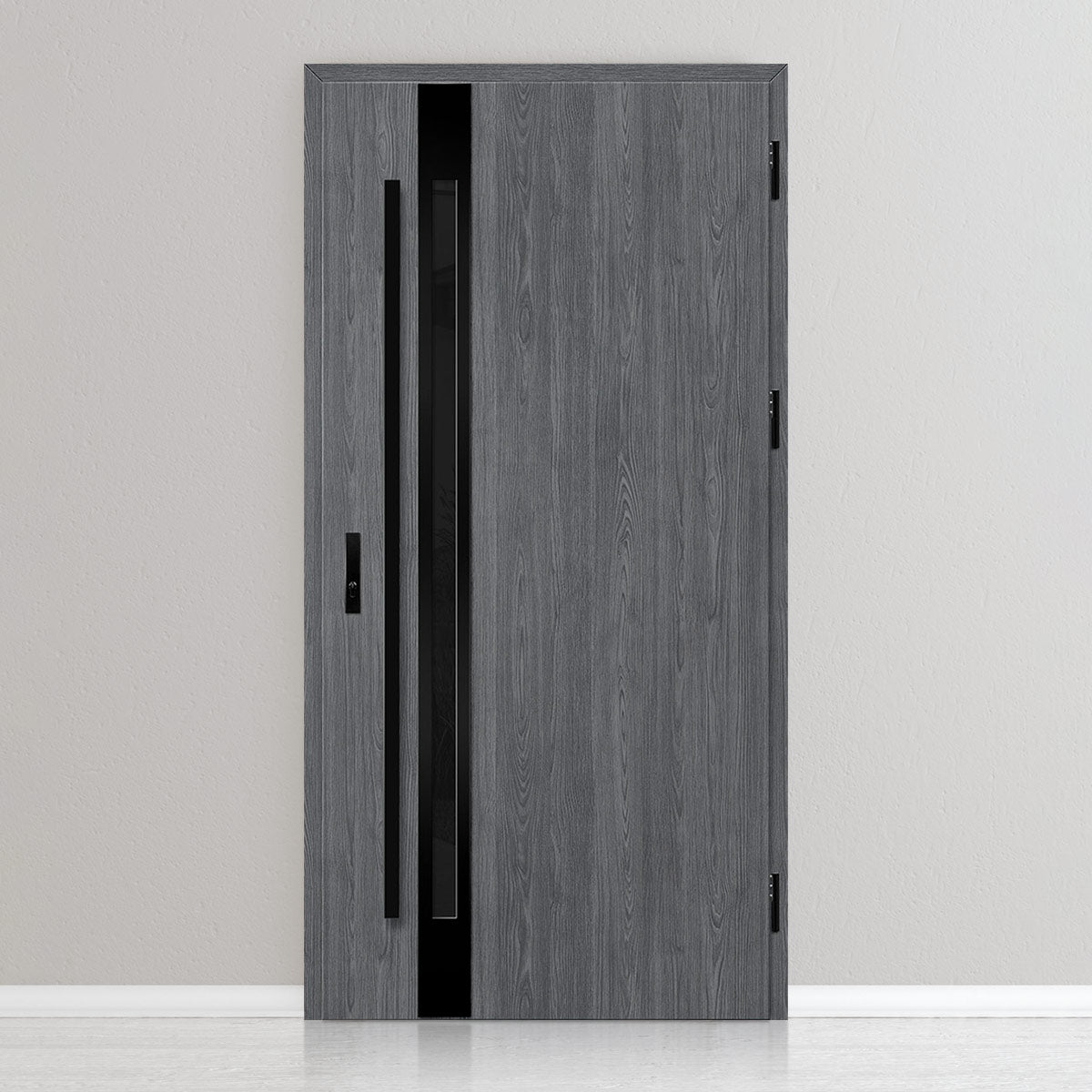 Вратата е изработена од поцинкуван челичен лим со дебелина од 0,6 мм и ПВЦ облога. Крилото е исполнето со полиуретанска пена со густина од 750g/m3, а рамката е изработена од залепено борово дрво. ПВЦ облогата се одликува со висока отпорност на променливи атмосферски услови, УВ зрачење и механички оштетувања. Текстурата, прилагодена на декоративниот мотив, создава производ со висока естетска вредност, покрај неговата безбедност и квалитети отпорни на кражби.