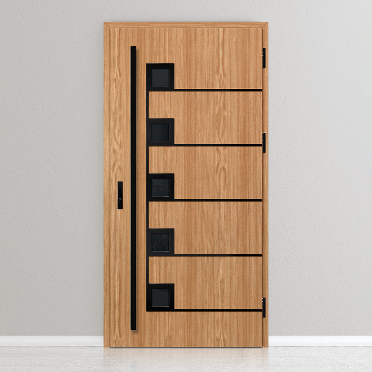 Вратата е изработена од поцинкуван челичен лим со дебелина од 0,6 мм и ПВЦ облога. Крилото е исполнето со полиуретанска пена со густина од 750g/m3, а рамката е изработена од залепено борово дрво. ПВЦ облогата се одликува со висока отпорност на променливи атмосферски услови, УВ зрачење и механички оштетувања. Текстурата, прилагодена на декоративниот мотив, создава производ со висока естетска вредност, покрај неговата безбедност и квалитети отпорни на кражби.