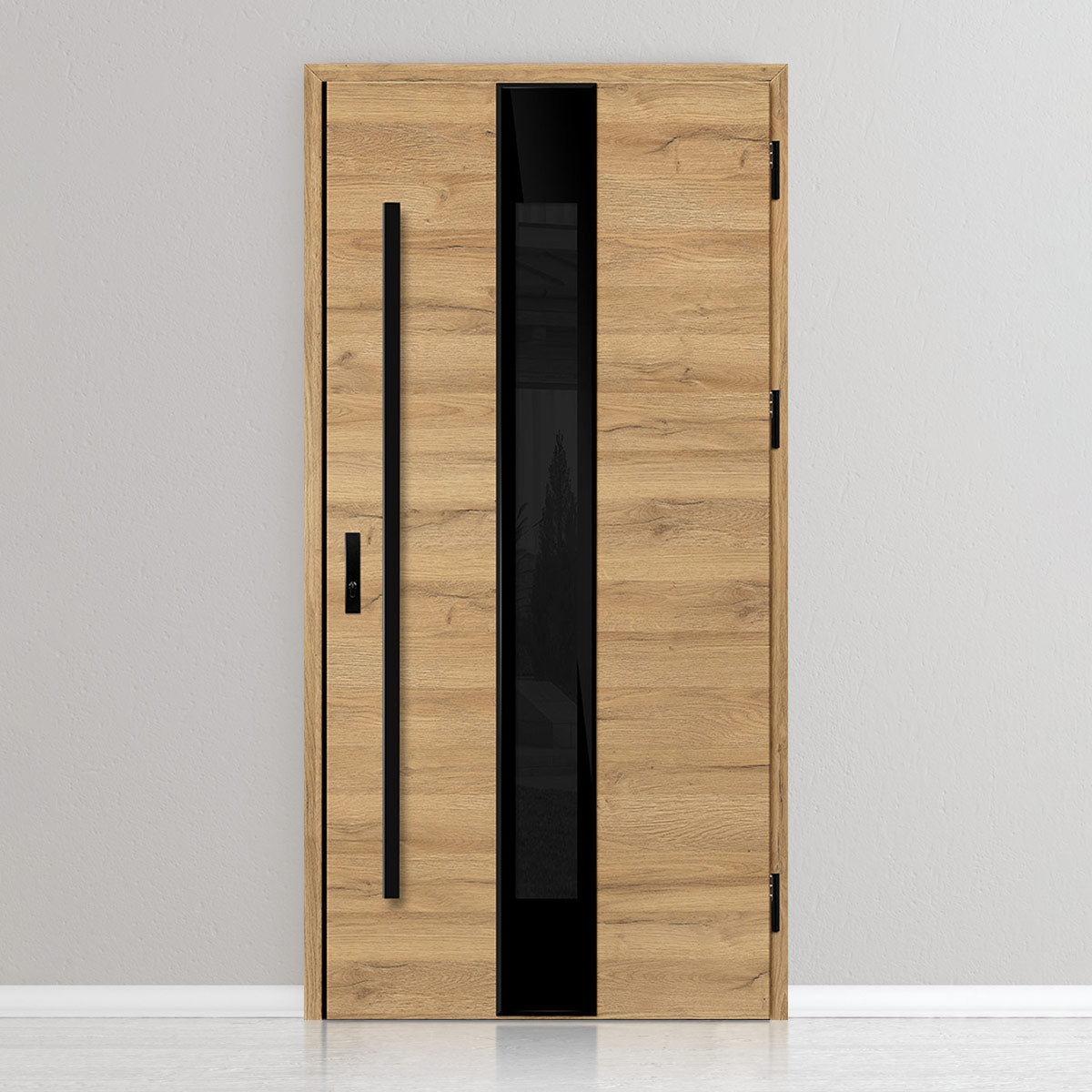 Вратата е изработена од поцинкуван челичен лим со дебелина од 0,6 мм и ПВЦ облога. Крилото е исполнето со полиуретанска пена со густина од 750g/m3, а рамката е изработена од залепено борово дрво. ПВЦ облогата се одликува со висока отпорност на променливи атмосферски услови, УВ зрачење и механички оштетувања. Текстурата, прилагодена на декоративниот мотив, создава производ со висока естетска вредност, покрај неговата безбедност и квалитети отпорни на кражби.