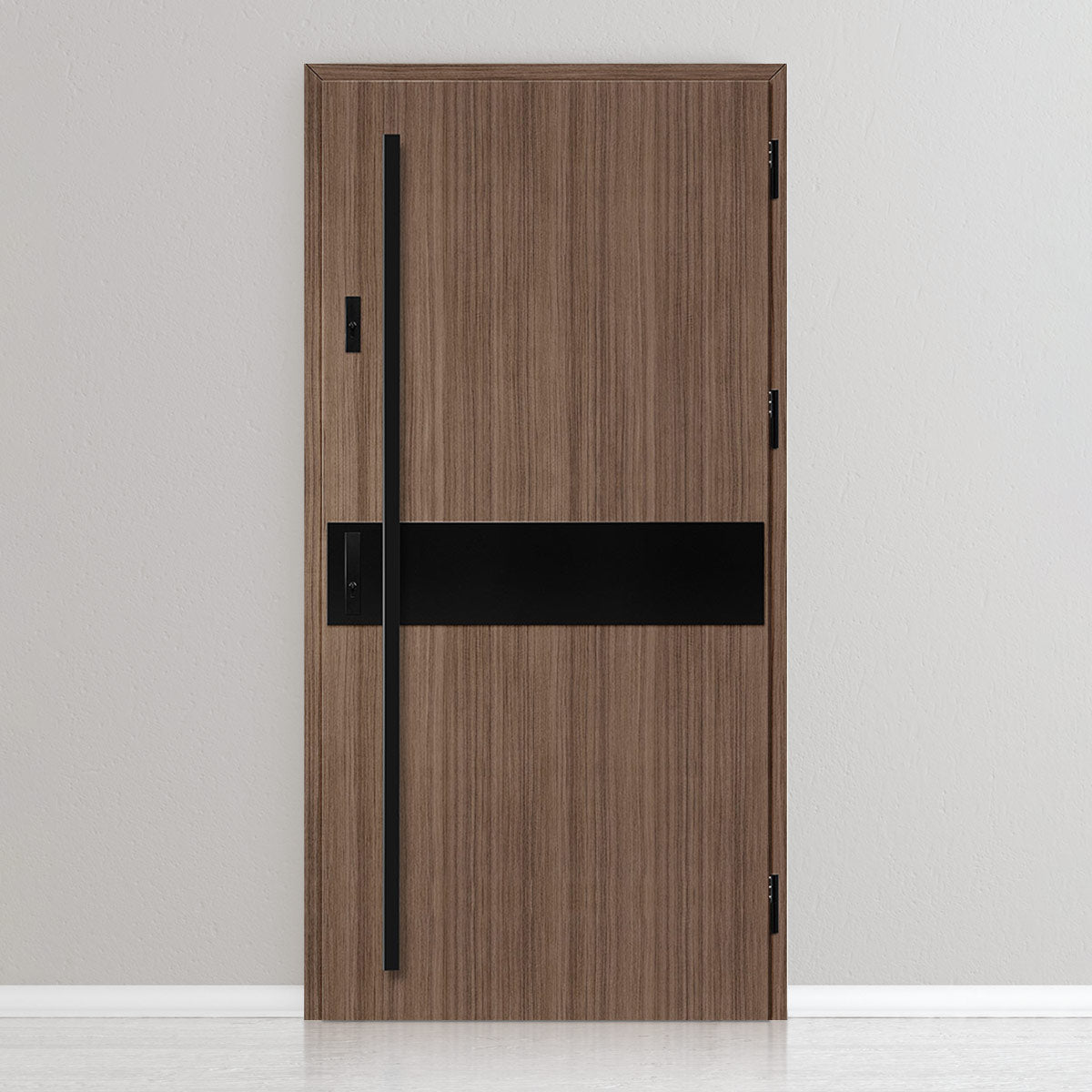 Вратата е изработена од челичен поцинкован лим со дебелина 0,6мм и PVC декор. Крилото е со полнеж од полиуретанска пена со густина 750г/м3, а рамката е од лепена боровина. PVC декорот се одликува со висока отпорност на променливи атмосферски услови, UV-зрачење и механички оштетувања. Текстурата, прилагодена на декоративниот мотив, создава производ со висока естетска вредност, дополнително на неговите својства за безбедност и отпорност на провала.