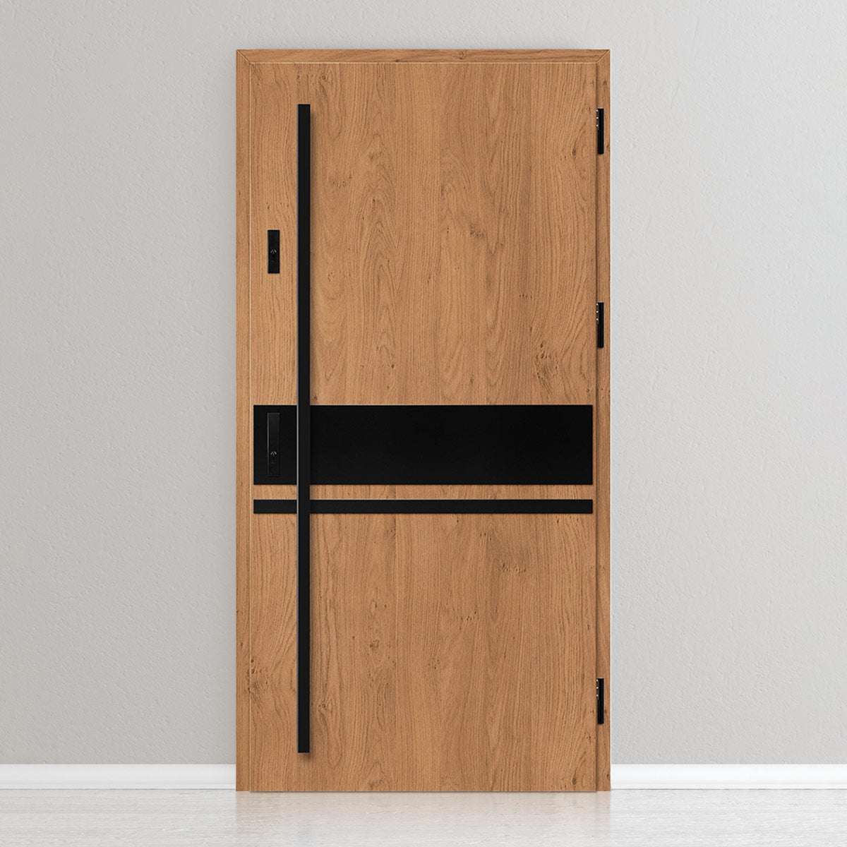 Вратата е изработена од челична поцинкована ламарина со дебелина 0,6мм и PVC декор. Крилото е со полнеж од полиуретанска пена со густина 750г/м3, а рамката е од лепена боровина. PVC декорот се одликува со висока отпорност на променливи атмосферски услови, UV-зрачење и механички оштетувања. Текстурата, прилагодена на декоративниот мотив, создава производ со висока естетска вредност, дополнително на неговите квалитети за безбедност и отпорност на провала.
