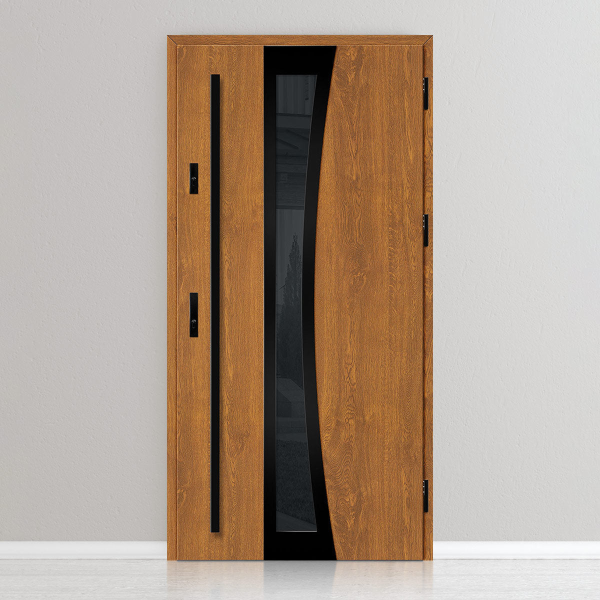 Вратата е изработена од челична поцинкована ламарина со дебелина 0,6мм и PVC декор. Крилото е со полнеж од полиуретанска пена со густина 750г/м3, а рамката е од лепена боровина. PVC декорот се одликува со висока отпорност на променливи атмосферски услови, UV-зрачење и механички оштетувања. Текстурата, прилагодена на декоративниот мотив, создава производ со висока естетска вредност, дополнително на неговите квалитети за безбедност и отпорност на провала.