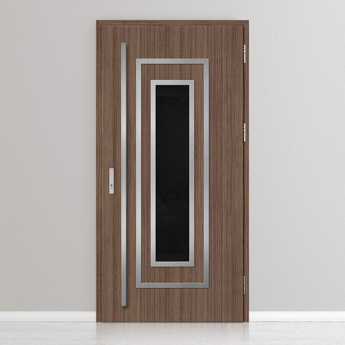 Вратата е изработена од челична поцинкована ламарина со дебелина 0,6мм и PVC декор. Крилото е со полнеж од полиуретанска пена со густина 750г/м3, а рамката е од лепена борова дрвесина. PVC декорот се одликува со висока отпорност на променливи атмосферски услови, UV-зрачење и механички оштетувања. Текстурата, адаптирана кон декоративниот мотив, создава производ со висока естетска вредност, покрај неговите квалитети за безбедност и отпорност на провала.