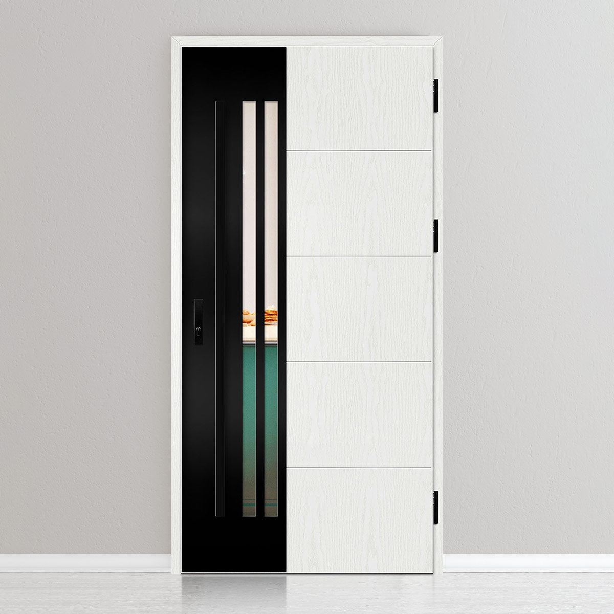 Вратата е изработена од челична поцинкована ламарина со дебелина 0,6мм и PVC декор. Крилото е со полнеж од полиуретанска пена со густина 750г/м3, а рамката е од лепена борова дрвесина. PVC декорот се одликува со висока отпорност на променливи атмосферски услови, UV-зрачење и механички оштетувања. Текстурата, адаптирана кон декоративниот мотив, создава производ со висока естетска вредност, дополнително на неговите квалитети за безбедност и отпорност на провала.