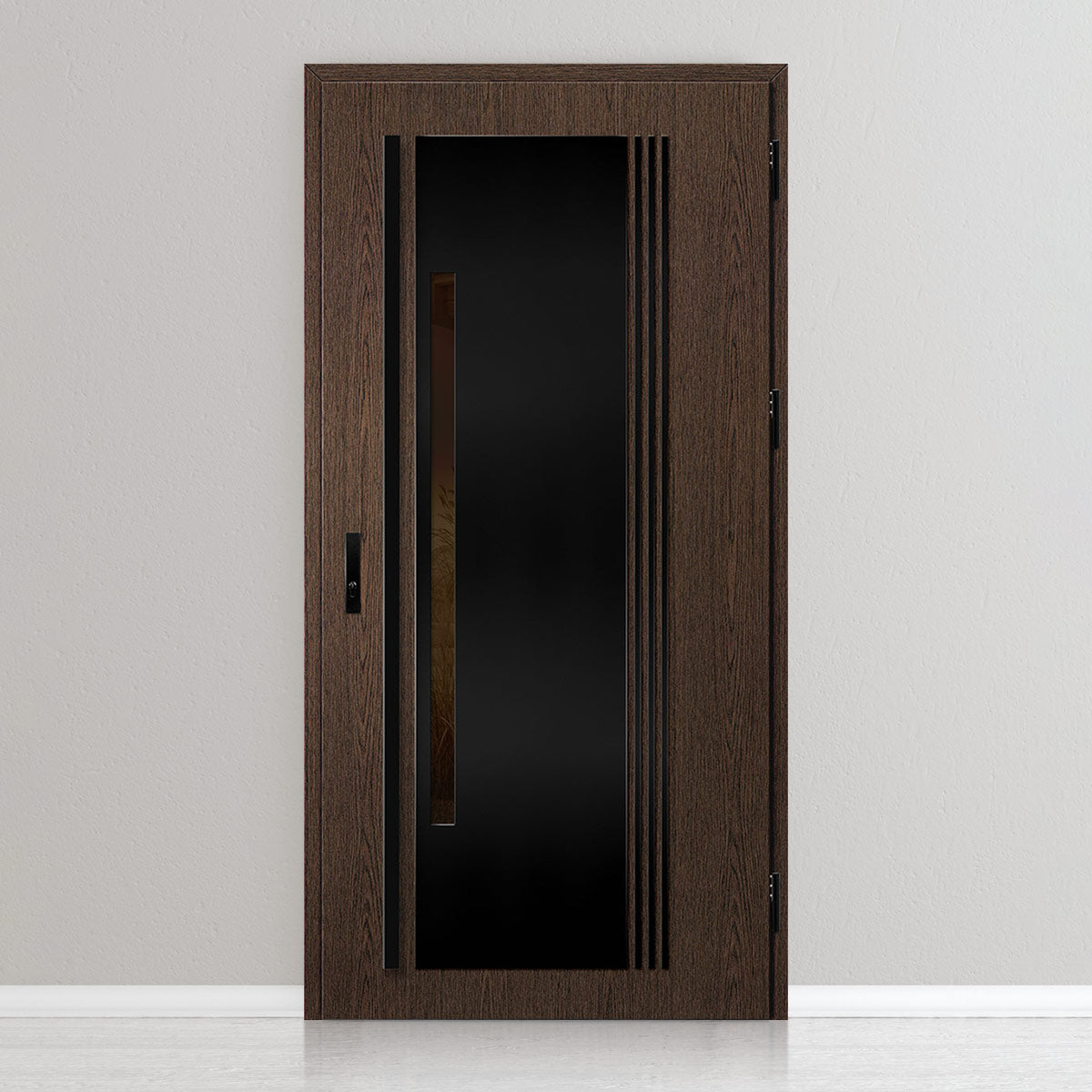 Вратата е изработена од челична поцинкована ламарина со дебелина 0,6мм и PVC декор. Крилото е со полнеж од полиуретанска пена со густина 750г/м3, а рамката е од лепена боровина. PVC декорот се одликува со висока отпорност на променливи атмосферски услови, UV-зрачење и механички оштетувања. Текстурата, прилагодена на декоративниот мотив, создава производ со висока естетска вредност, дополнително на неговите својства за безбедност и отпорност на провала.