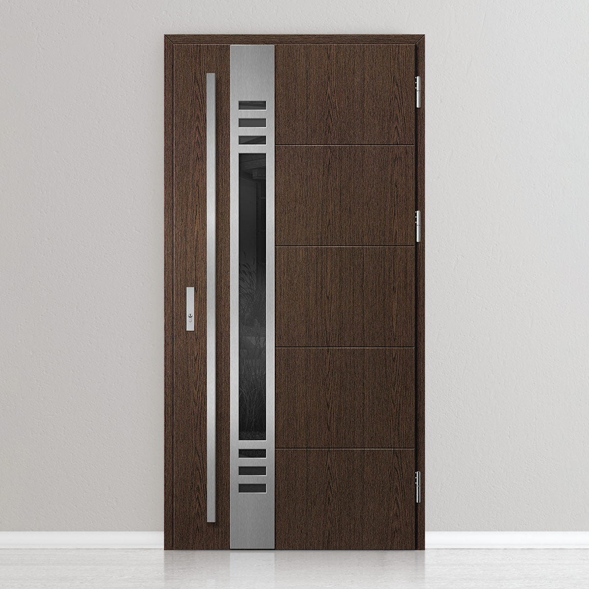 Вратата е изработена од челична поцинкована ламарина со дебелина 0,6мм и PVC декор. Крилото е со полнеж од полиуретанска пена со густина 750г/м3, а рамката е од лепена борова дрвесина. PVC декорот се одликува со висока отпорност на променливи атмосферски услови, UV-зрачење и механички оштетувања. Текстурата, адаптирана кон декоративниот мотив, создава производ со висока естетска вредност, дополнително на неговите квалитети за безбедност и отпорност на провала.
