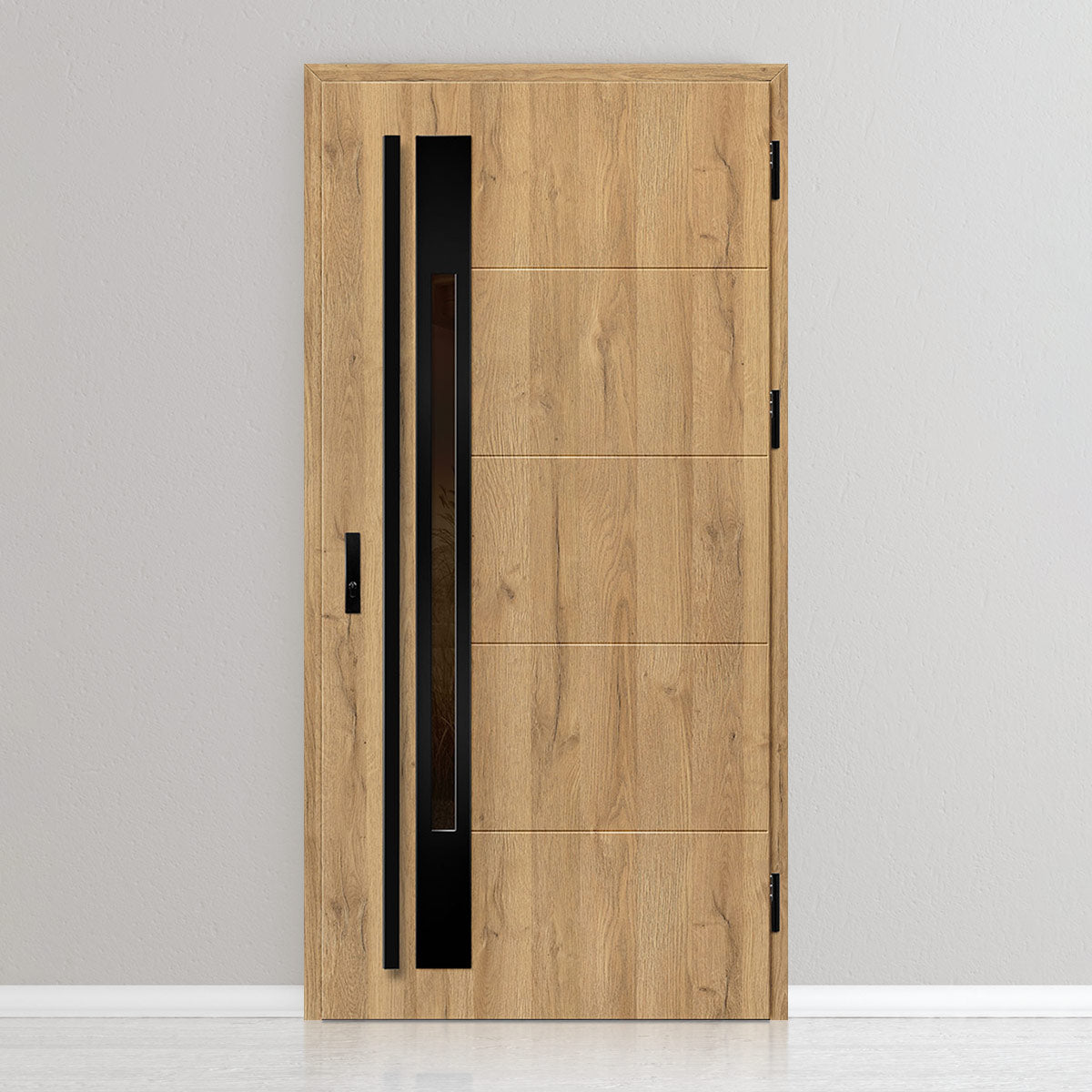 Вратата е изработена од челичен поцинкуван лим со дебелина 0,6мм и PVC декор. Крилото е со полнеж од полиуретанска пена со густина 750г/м3, а рамката е од лепена боровина. PVC декорот се одликува со висока отпорност на променливи атмосферски услови, UV-зрачење и механички оштетувања. Текстурата, прилагодена на декоративниот мотив, создава производ со висока естетска вредност, дополнително на неговите квалитети за безбедност и отпорност на провала.